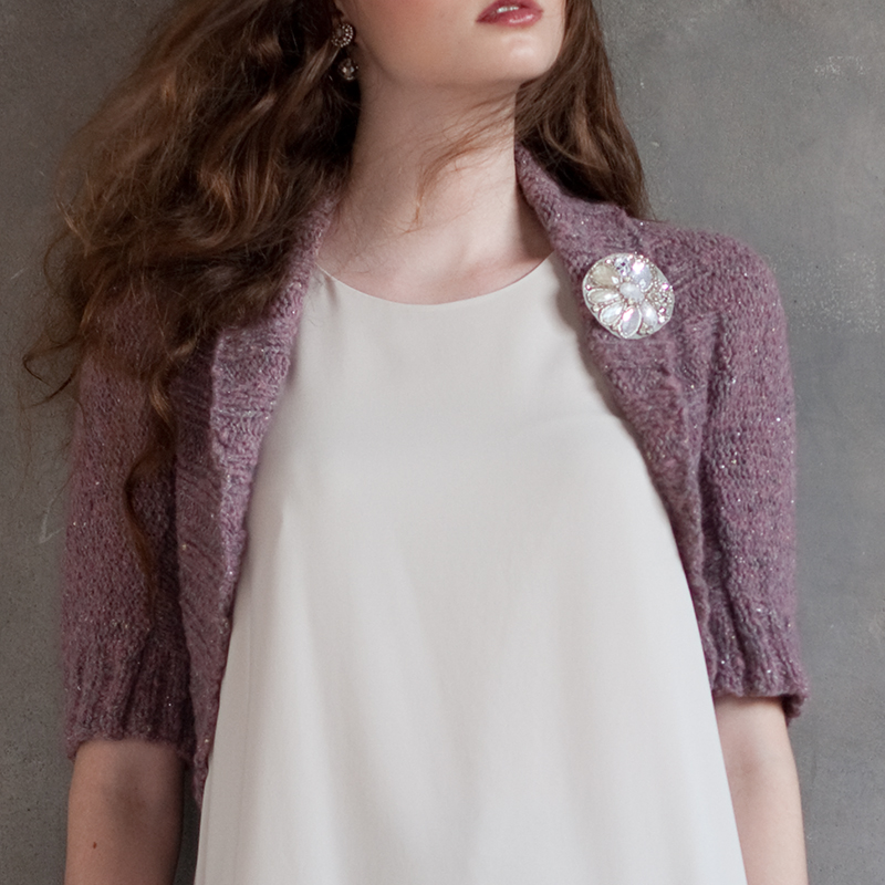 金と銀のラメが入った上品な輝きを見せる素材使いのマーガレットは、表目と裏目だけで、表情の違いをシンプルに表しました。短め丈のマーガレットは、さっと羽織るようにアクセサリー感覚で着こなして。
