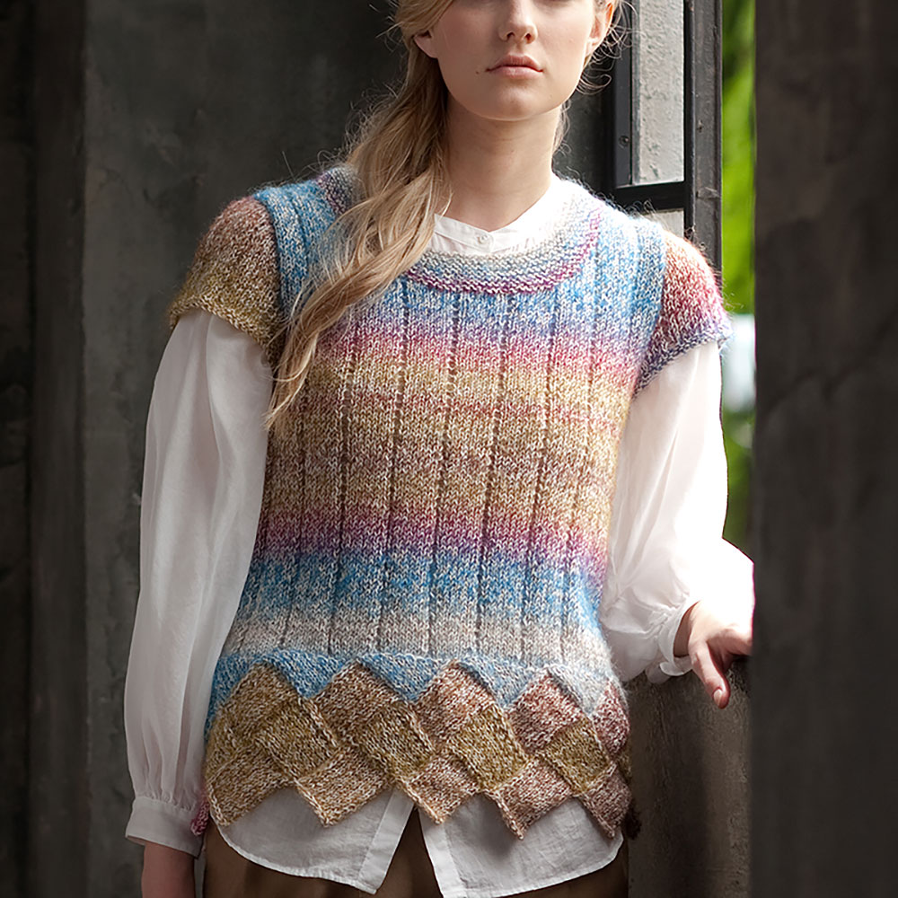 裾にあじろ編みを配置し、手編みならではの技法を取り入れた半袖のセーター。編むのが楽しくなるような、段染めのファンシーヤーンを使用し、メリヤス編みの中に、縦にシンプルな透かし模様を入れました。