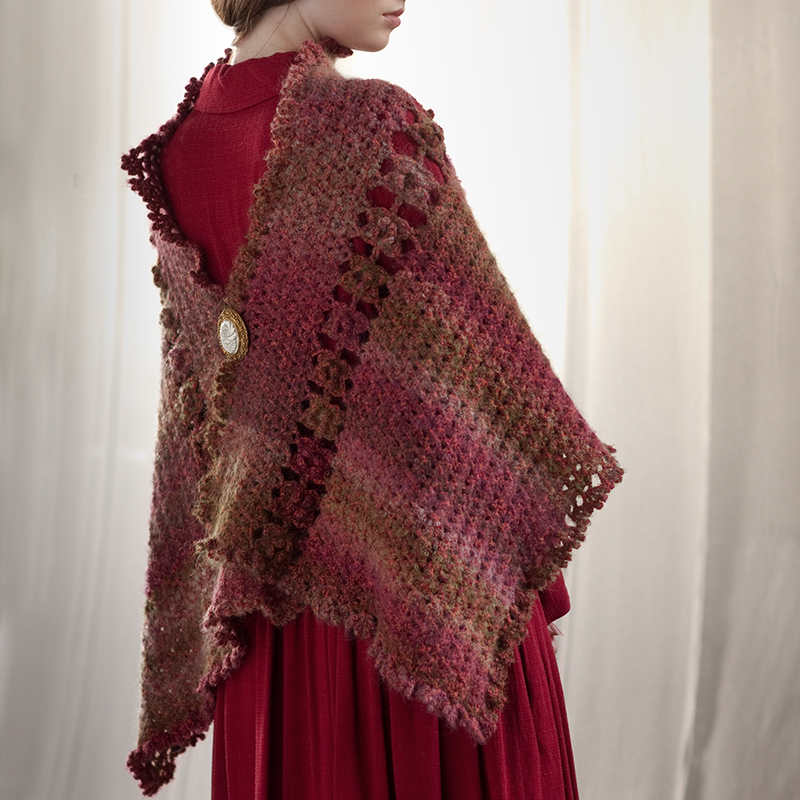 シンプルな模様の中に、立体的な花のモチーフを一列編み入れたマーガレット。ボタンをはずして前で巻いたり、後ろでブローチでとめたりと、ストールとしての着こなしが様々に楽しめます。