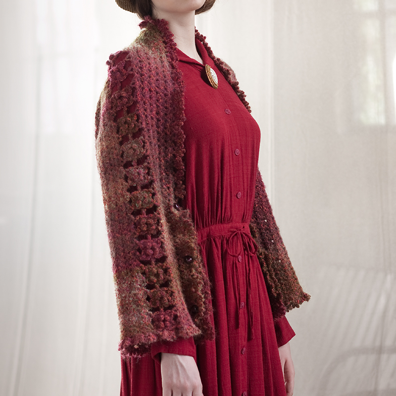 材料:パピー デッラルバ 赤・オレンジ色・ローズ色・こげ茶・グレー系のからみ(104)420g=11玉、直径1.8cmのボタン6個