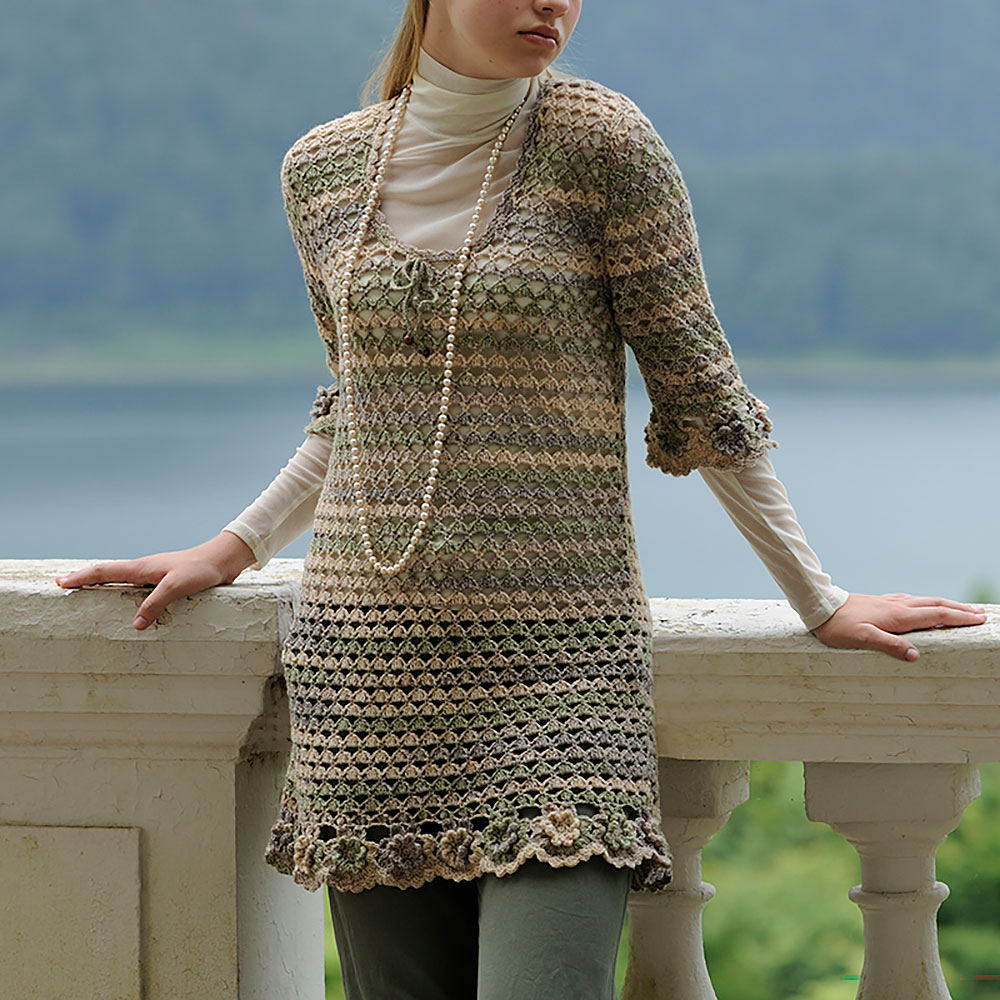 かすり調の段染め糸に金ラメがからんだ糸使いの、かぎ針編みのチュニック。ベースのかぎ針の模様はシンプルにし、身頃裾と袖口に花モチーフをあしらい、変化をつけました。