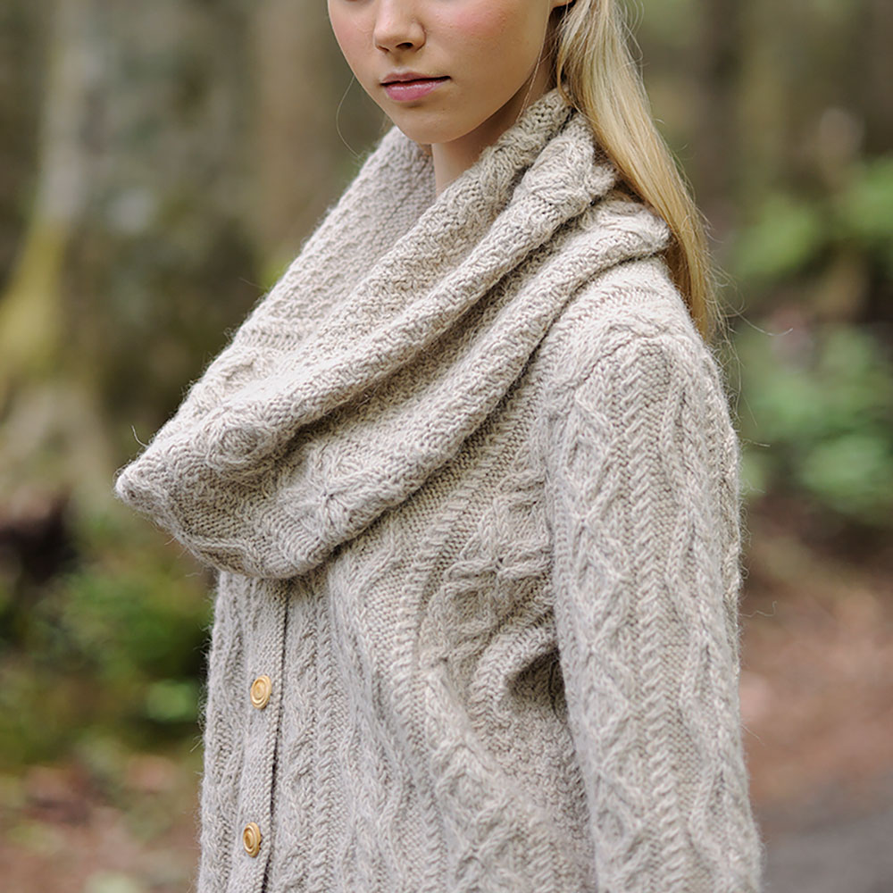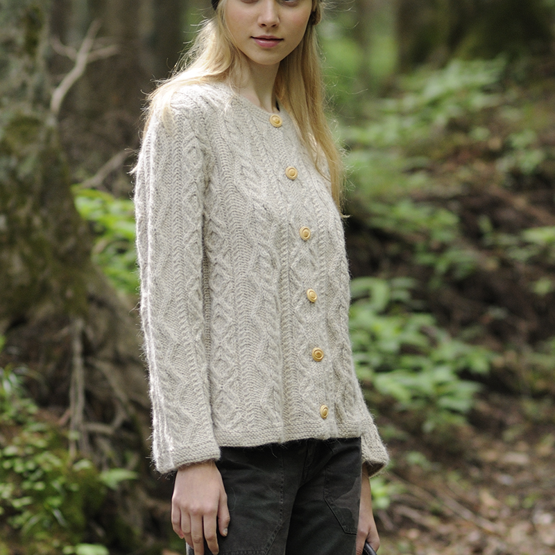 材料:内藤商事(株) ガビアーノ ベージュ(102) [ジャケット]540g=11玉、[ネックウォーマー]150g=3玉、直径2.2cmのボタン6個