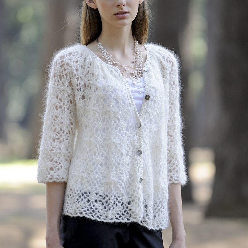 四角のモチーフをつないだ円形ボレロは、裾から衿元に向かって大から小のモチーフをつなげていきます。モヘア糸の儚げな透け感が、女性らしさを引き立ててくれます。