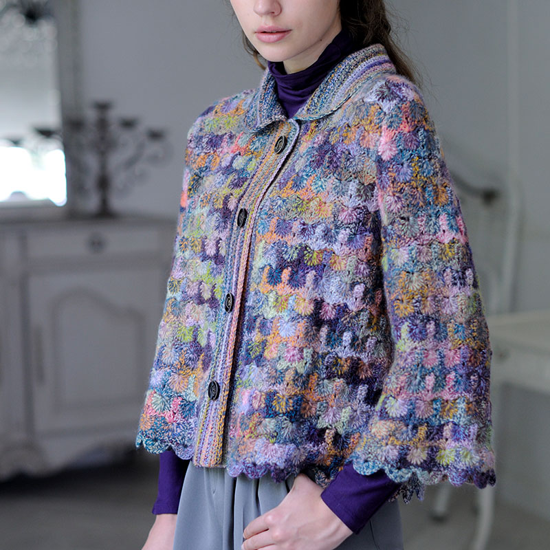 編むものによって、違う色の出方が楽しめる段染め糸を使っています。小花のような模様のかぎ針ジャケットは、裾広がりのショート丈で、マントのゆなフォルムが楽しめます。