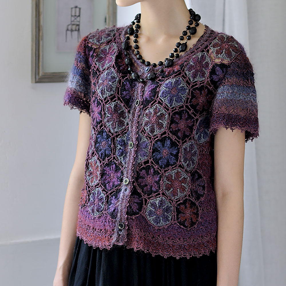 4種類の糸で編んだモチーフカーディガンは、配色のトーンを合わせた絶妙なバランスで、上品な色合わせが楽しめます。後見頃は、モチーフではなく、袖と同様の模様編みで編んでいます。