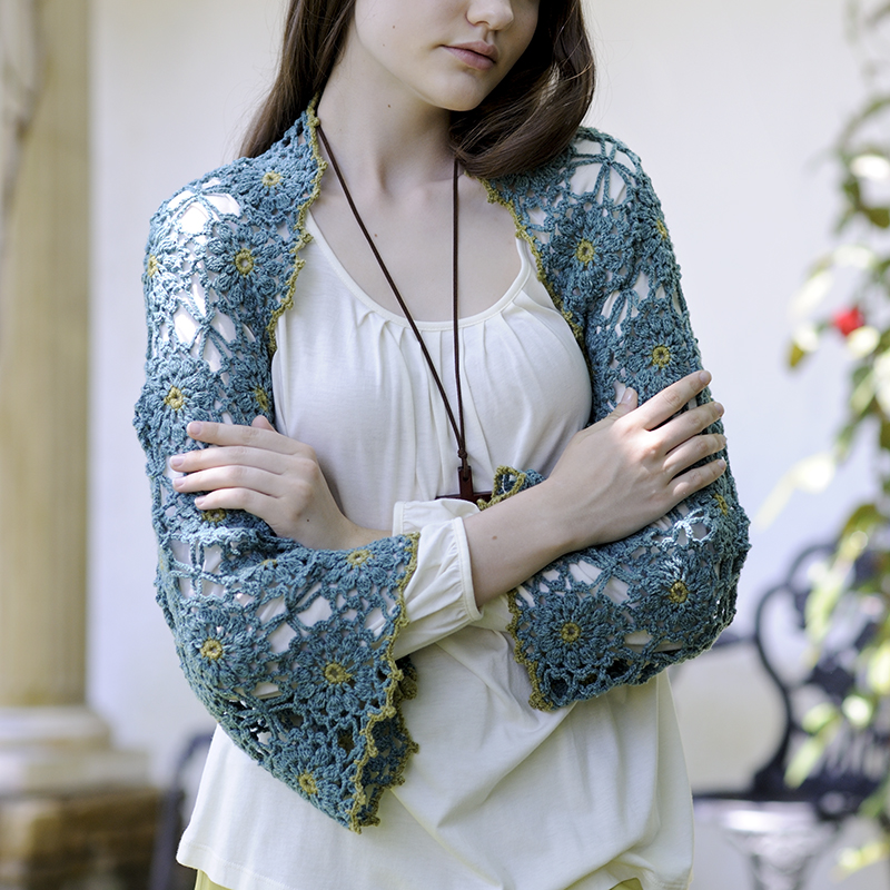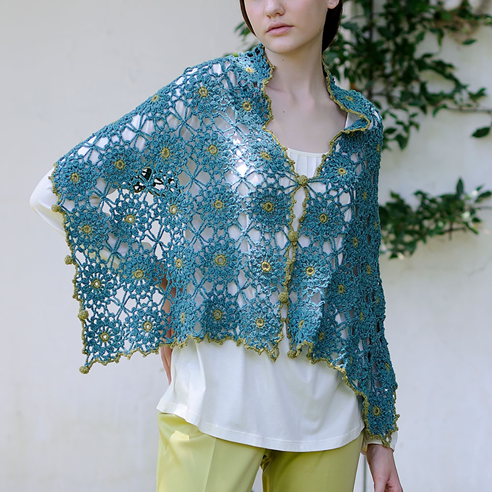 四角形モチーフをまっすぐに編みつなぎ、ボタンをつけた2wayニット。筒状にボタンをとめればマーガレット、そのままでストールとして。片端だけとめたストール使いも素敵です。
