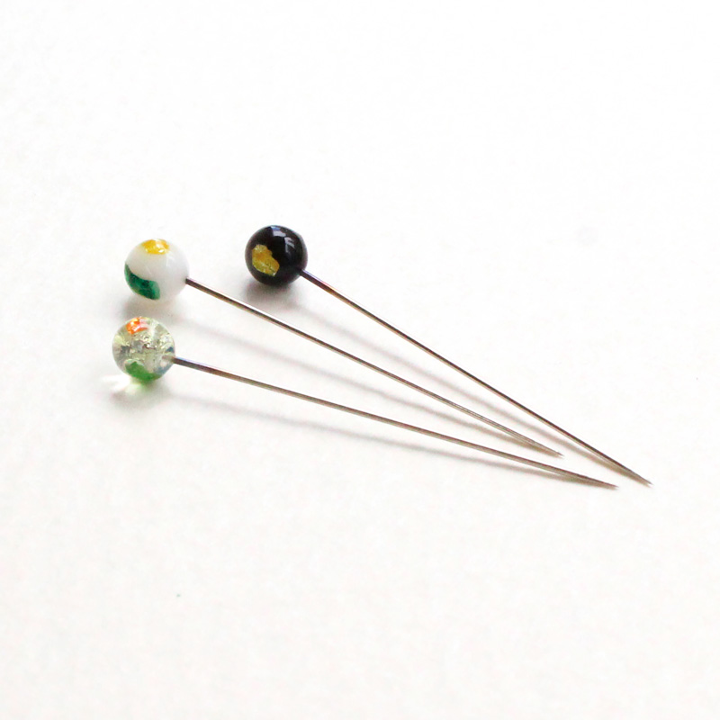 ▲薄片状にした七宝焼をガラス玉に貼りつけて作るまち針3本をセット