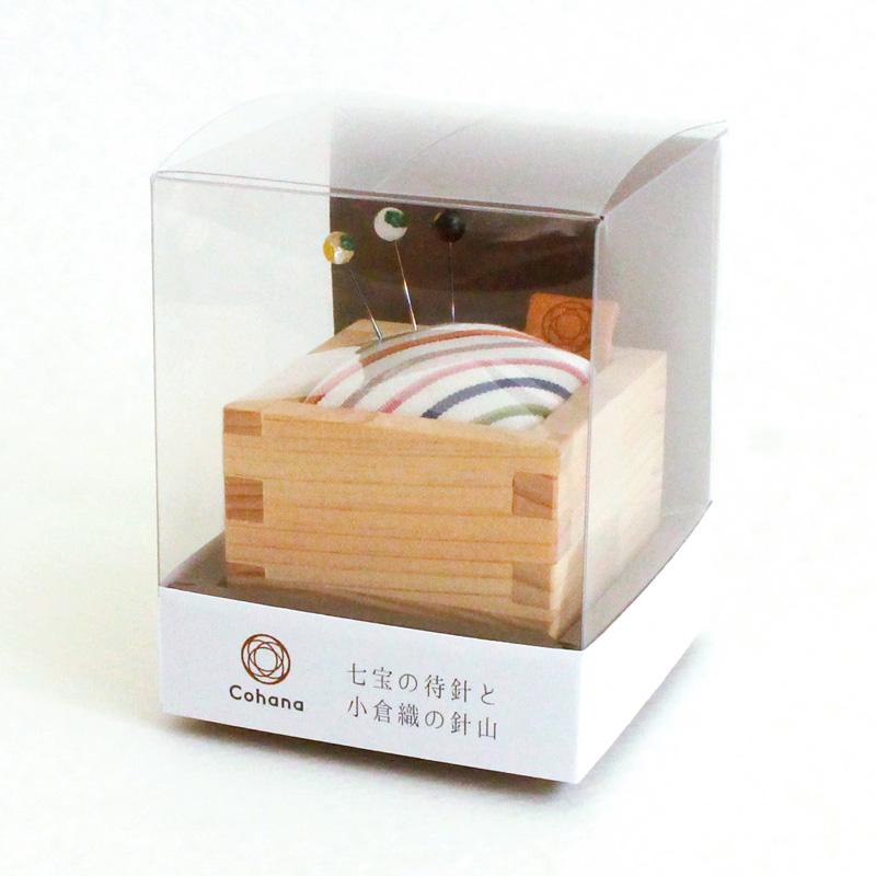 【限定40】香り豊かな国産ヒノキの枡に立体的な縞が特徴の小倉織を合わせた、和モダン調のおしゃれな針山。七宝のまち針つきでお届けします。