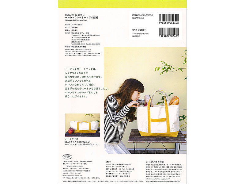 切り抜いてそのまま使える! 型紙BOOKシリーズ。しっかりとした厚さで、丈夫な仕上がりの帆布を使い、家庭用ミシンで作れるシンプルな作り方でトートバッグを提案します。分からないところはお電話やメールでの質問もOK。
