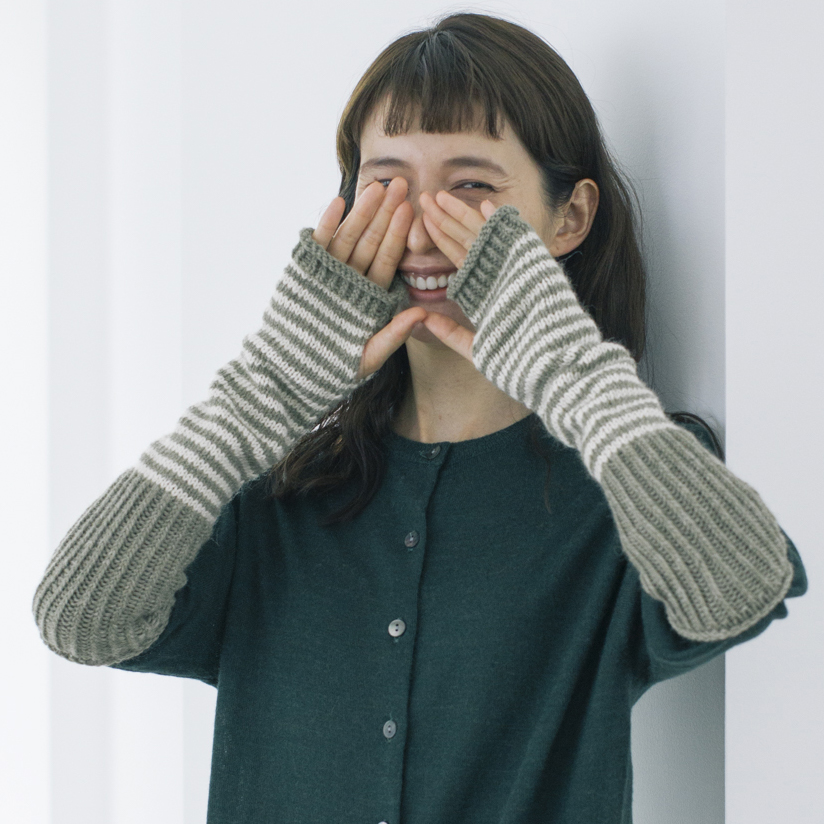 裏目をねじって編むねじりゴム編みで縦ラインを強調。ボーダーと組み合わせて、上下逆にもつけられるように。親指穴は往復で、それ以外は輪で編みます。