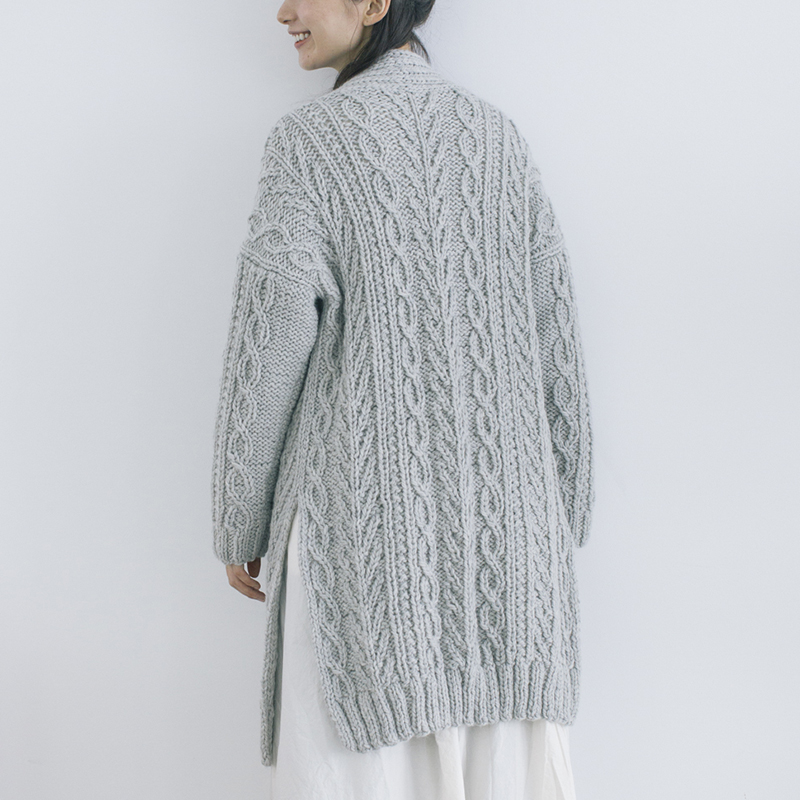 コートとカーディガンの中間=コーディガン。大物ですが、極太糸でほぼまっすぐ編み、仕立てもわかりやすいので、ぜひチャレンジを!
