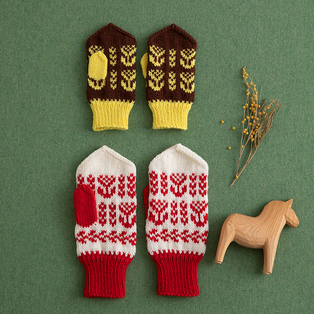 親子でリンクしたチューリップ柄がかわいいミトン。よく動く子ども用には汚れが目立たたない濃い目の色をチョイスしました。