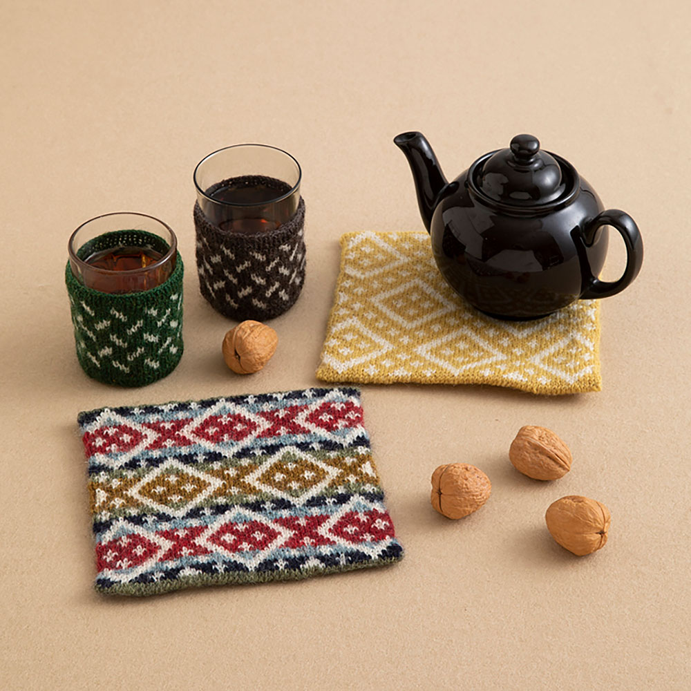 材料:[ポットマット]a: 黄(035)22g 白(001)15g b:白(001)15g 赤(013)8g 黄緑(028)7g 紺(003)・水色(064)・黄土色(065)各6g [カップカバー]A:こげ茶(022)8g 白(001)4g B: 深緑(034)8g 白(001)4g