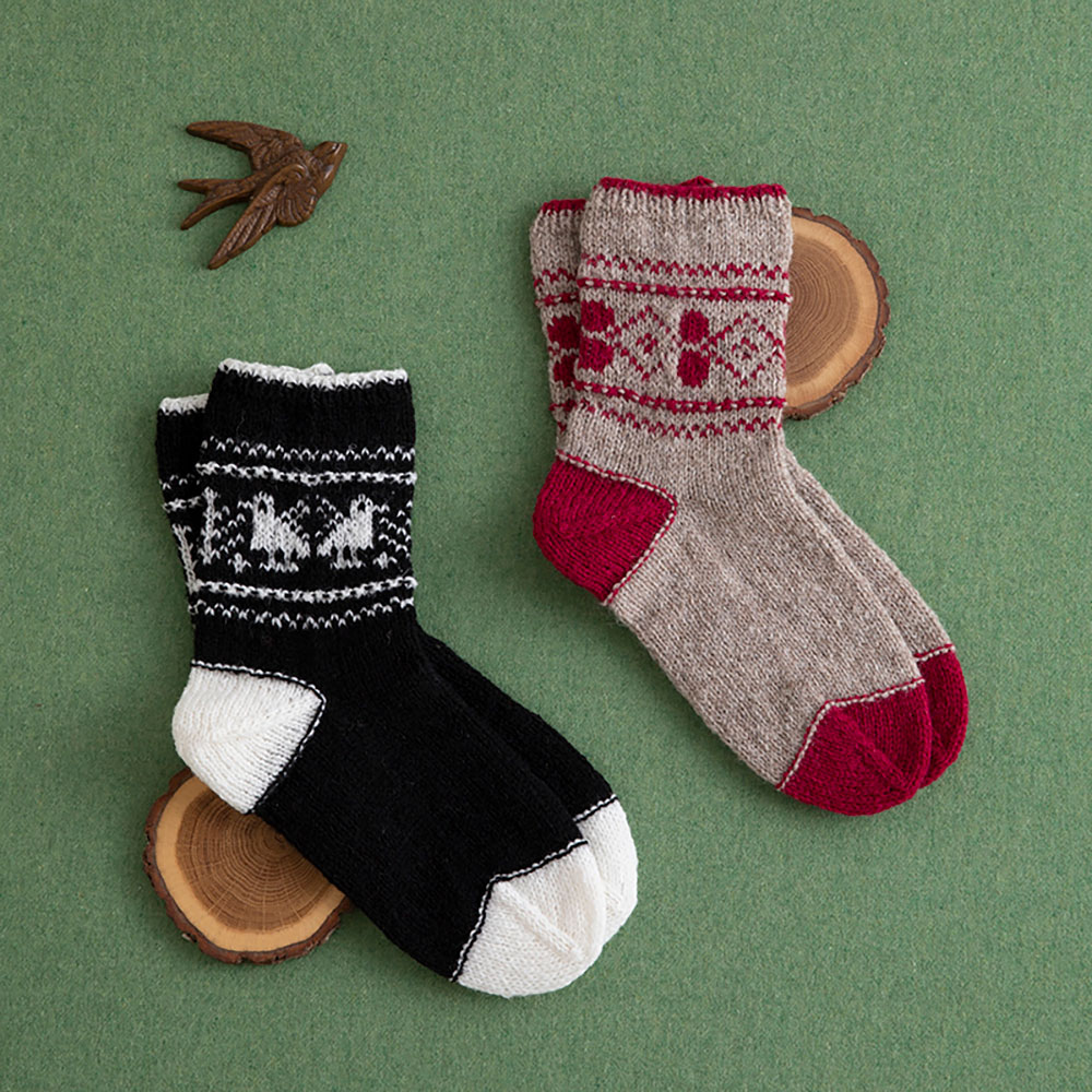 足首の柄や色が違うだけで表情の違った1足ができあがります。プレゼントにも喜ばれそうなかわいい柄の靴下です。