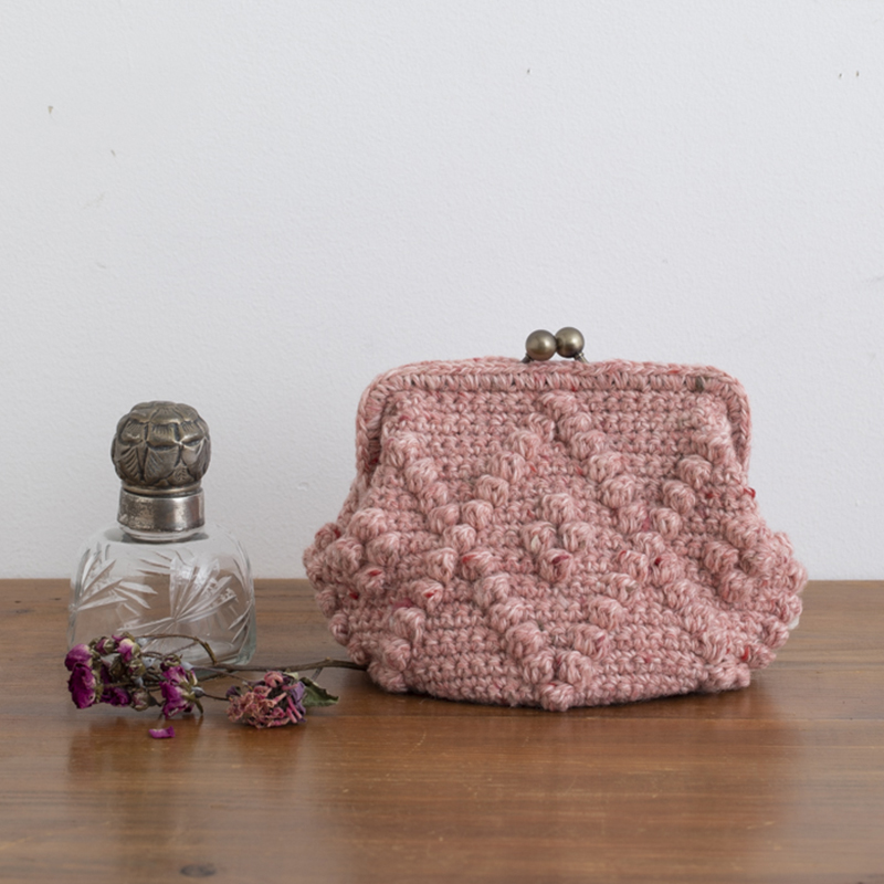 ボッブルをダイヤ形に並べたアラン模様風のがま口ポーチ。ツイード系でニュアンスをつけました。