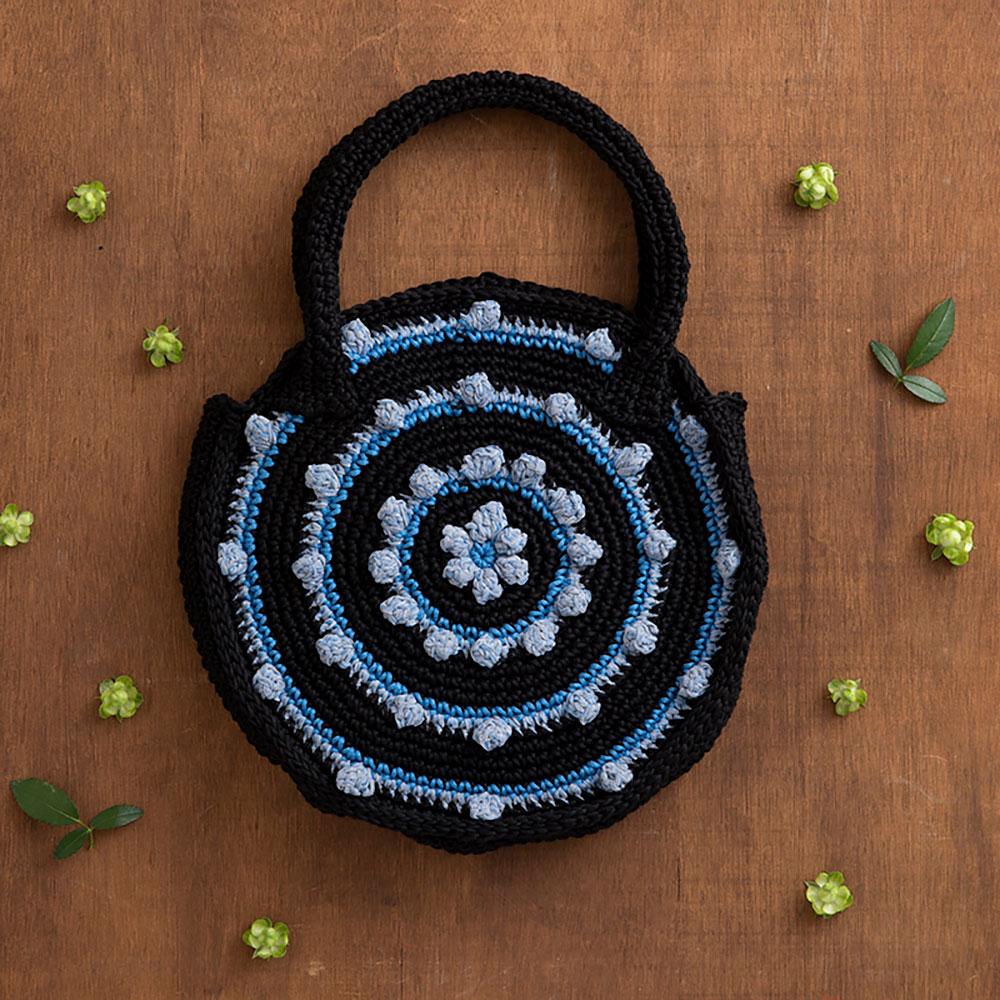 ボッブルを丸く編み広げたバッグ。黒のベースに2色のブルーが際立ちます。中心はボッブルの花模様。マチつきで収納力もしっかりあります。