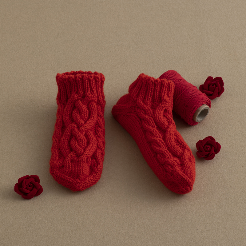 気分を上げてくれそうな真っ赤な色合いが素敵なルームシューズ。かかとに穴が開いてもほどいて編みなおしやすい構造になっています。はき口のゴム編みはお好みで長めに編んで折り返してみてもかわいいですよ。