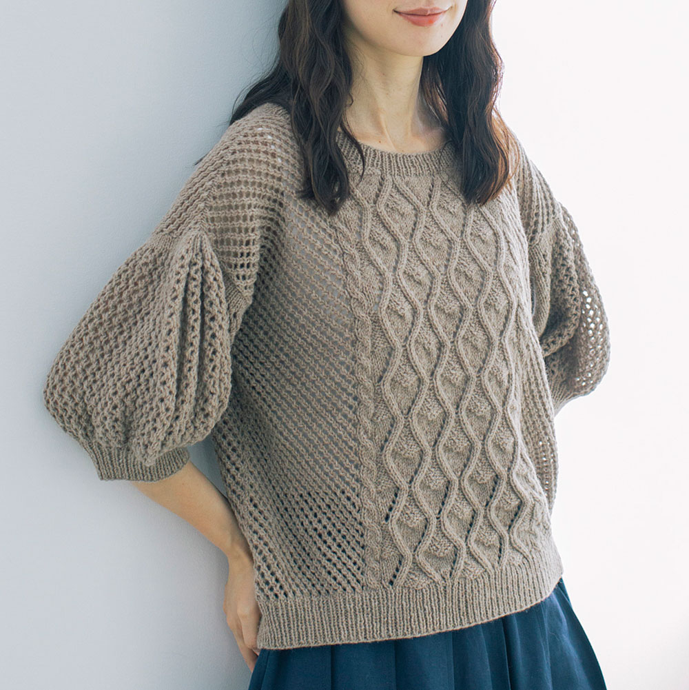 半端な袖丈がキュートなニット。身頃のサイドと袖を透かし編みにしてボリュームダウンしています。季節の変わり目の、ニットの装いにぜひ。