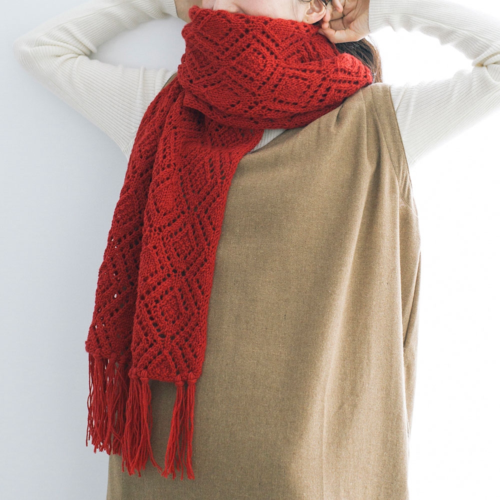 透かし模様が全体に入ったショール。元気な赤を身に着けると、気持ちも上がるし、コーディネートも引き締まります。