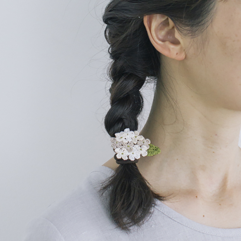 清廉な白とニュアンスのあるベージュで印象的なあじさいモチーフ。可愛らしさと大人っぽさを兼ね備えたヘアアクセサリーです。サークルブローチは、色を少しずつ変えながら編み、円形の土台にとめつけています。ちょっとした隙間の時間に、モチーフを編みためて作れるのが嬉しいですね。
