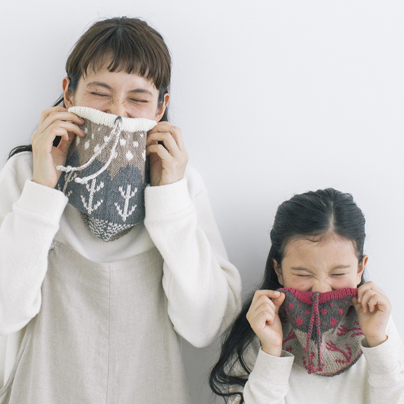 冬景色をモチーフにした、編み込みのネックウォーマー。大人向けにはシックなグレートーン。子供向けにはかわいいアクセントカラーを入れて。