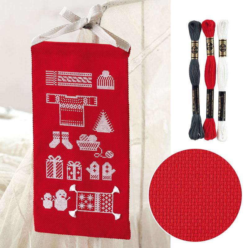 DMC25番刺しゅう糸(糸長8m、6本より)3色各1束、14ctアイーダ(38.1×45.7cm)1枚