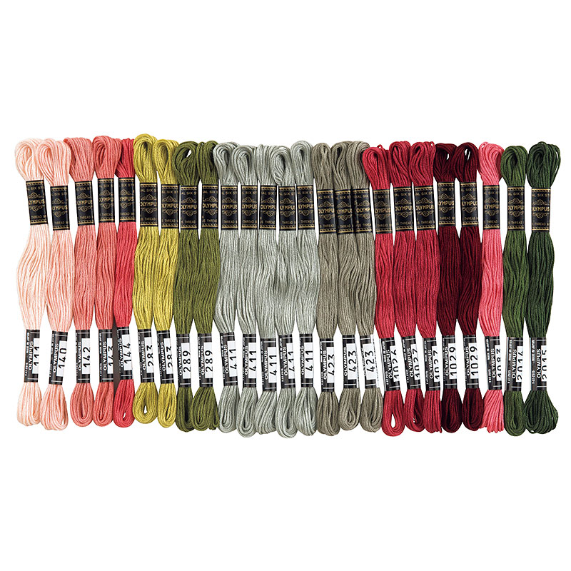 ステッチイデーvol.34 15ページに掲載の作品に使用した、オリムパス25番刺しゅう糸のセット。作品作りに必要な束数が入っています。