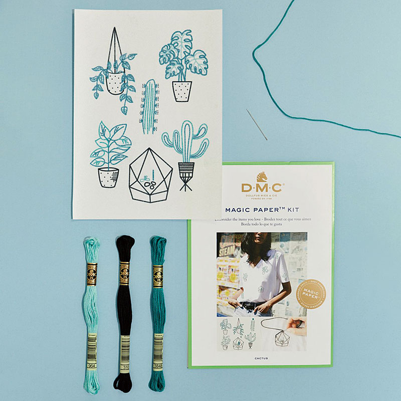 図案印刷済みマジックペーパー(15×21㎝)、DMC25番刺しゅう糸、刺しゅう針、簡単な説明書(英語・仏語)
