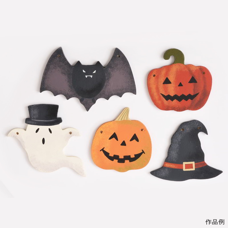 カボチャ2種類、コウモリ、おばけ、魔女の帽子のオーナメント5種セット。ハロウィンのキャラクターをつないでガーランドにして飾れます。