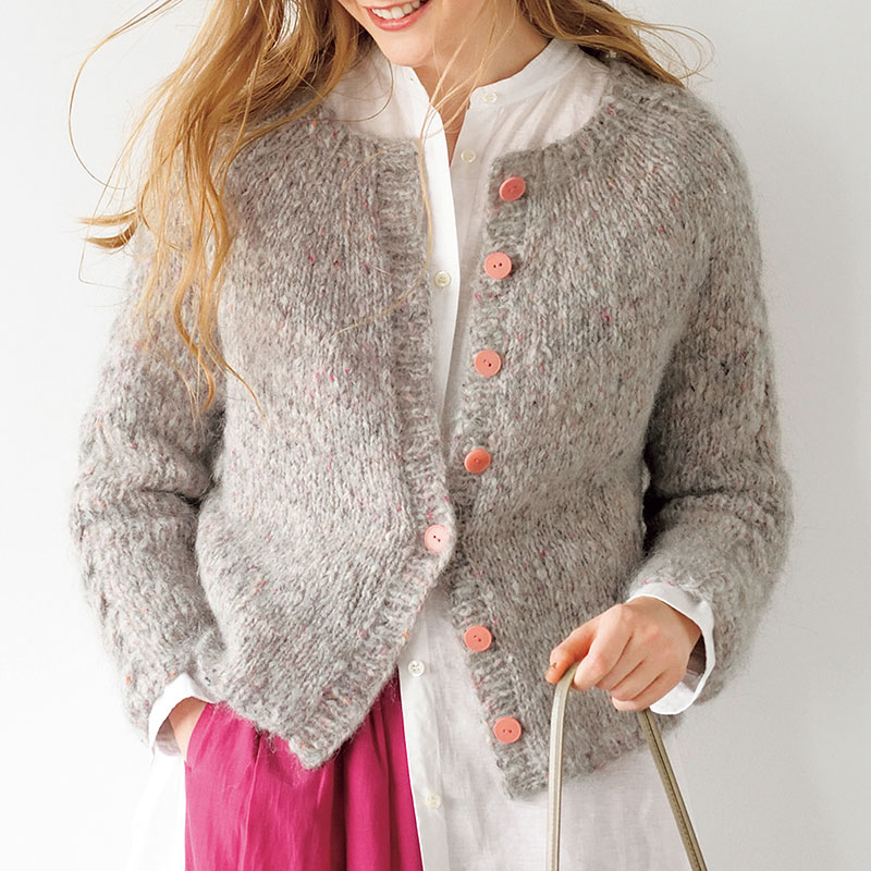 イギリス発のヤーンブランドROWANから新発売のふわふわツイードヤーンで編むカーディガンは、ごくごくシンプルなメリヤス編みに、袖のケーブルがワンポイントになっています。霜降りグレーにうっすらと混じるピンクの色を拾って、キャンディみたいなボタンをつけました。ボタンで印象が大きく変わるので、ボタン選びまで気を抜かないで。