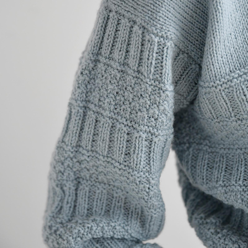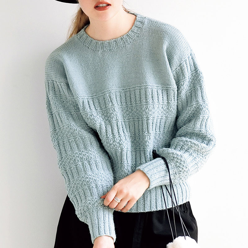 スモークブルーが印象的なプルオーバーは、 ヨーク下と袖に地模様を入れました。しつこ くならず、でもしっかりとした地模様は、表目 裏目で編めるので簡単です。ふっくらとした 長めの袖に短めの着丈が絶妙なバランス。