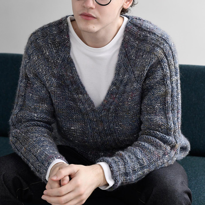 シンプルな編み地に太めのリブを効かせたVネックセーターはスウェット感覚で着てほしい。ネップのあるグラデーションカラーでおしゃれ感のある仕上がりになります。軽さと肌触りの良さにも注目です。