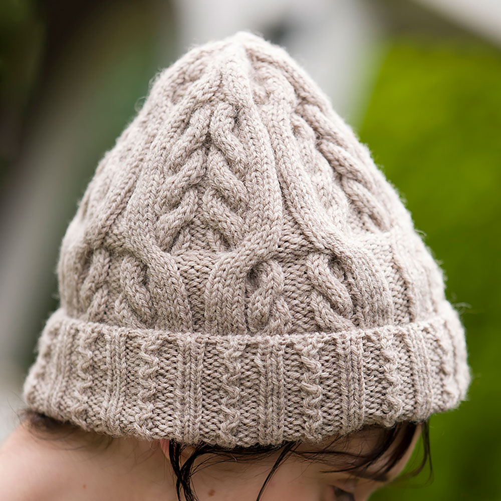 ベストとお揃いの大小のチェーンケーブル模様を使った キャップ。