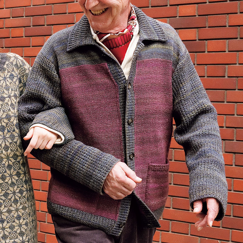 メリヤス編みの表裏と段染め糸の2色使い配色 が巧みなメンズジャケット。誰にでも好まれる すっきりとしたデザインは、プレゼントしても喜 ばれること間違いなし。大好きな人にプレゼン トして、時々拝借するのもいいかも。