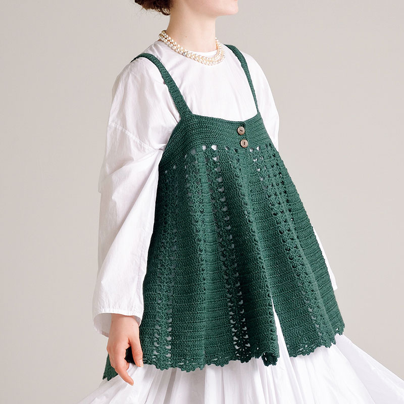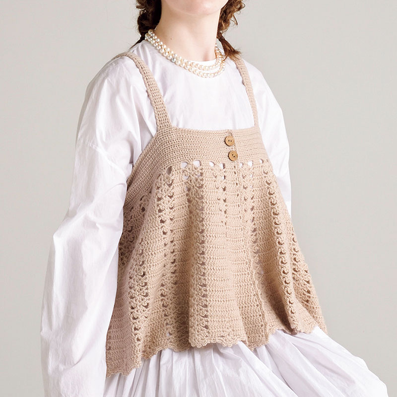 ケープをアレンジしてキャミソールに。 長編み部分で増し目をするので編みやすく、きれいなフレアーが楽しめるデザインです。
