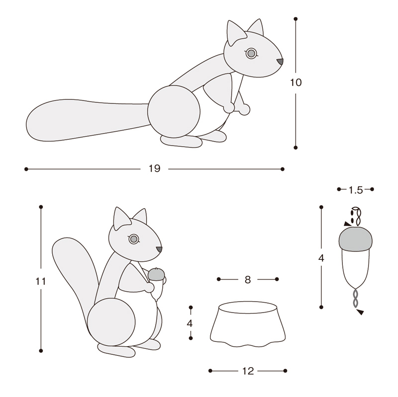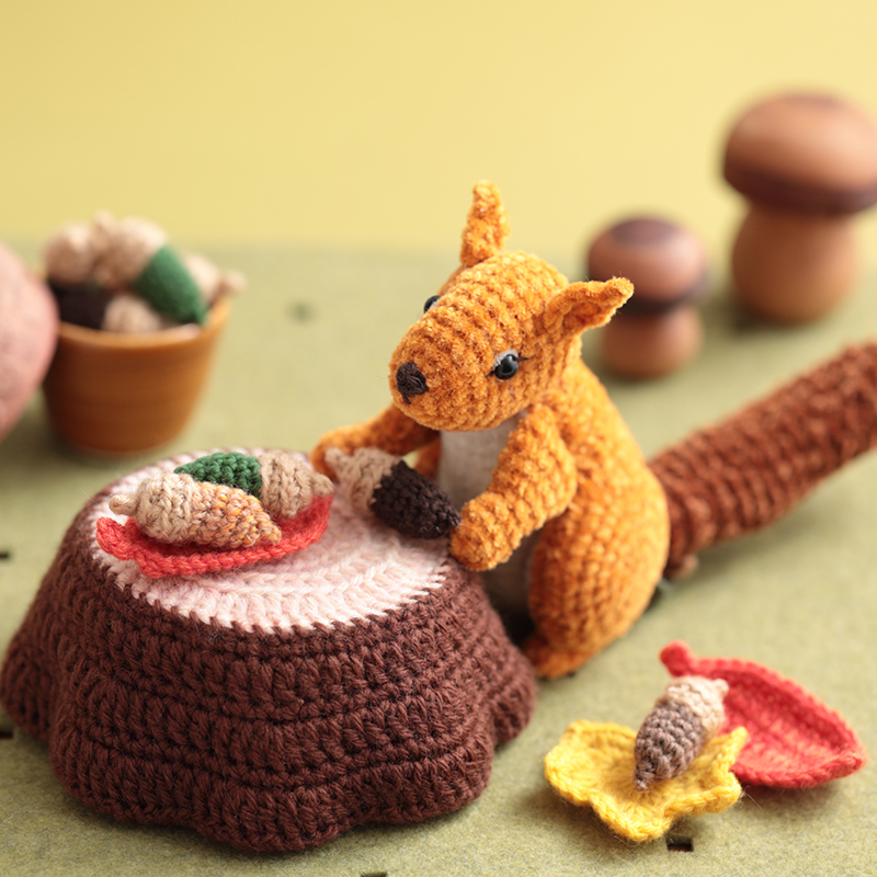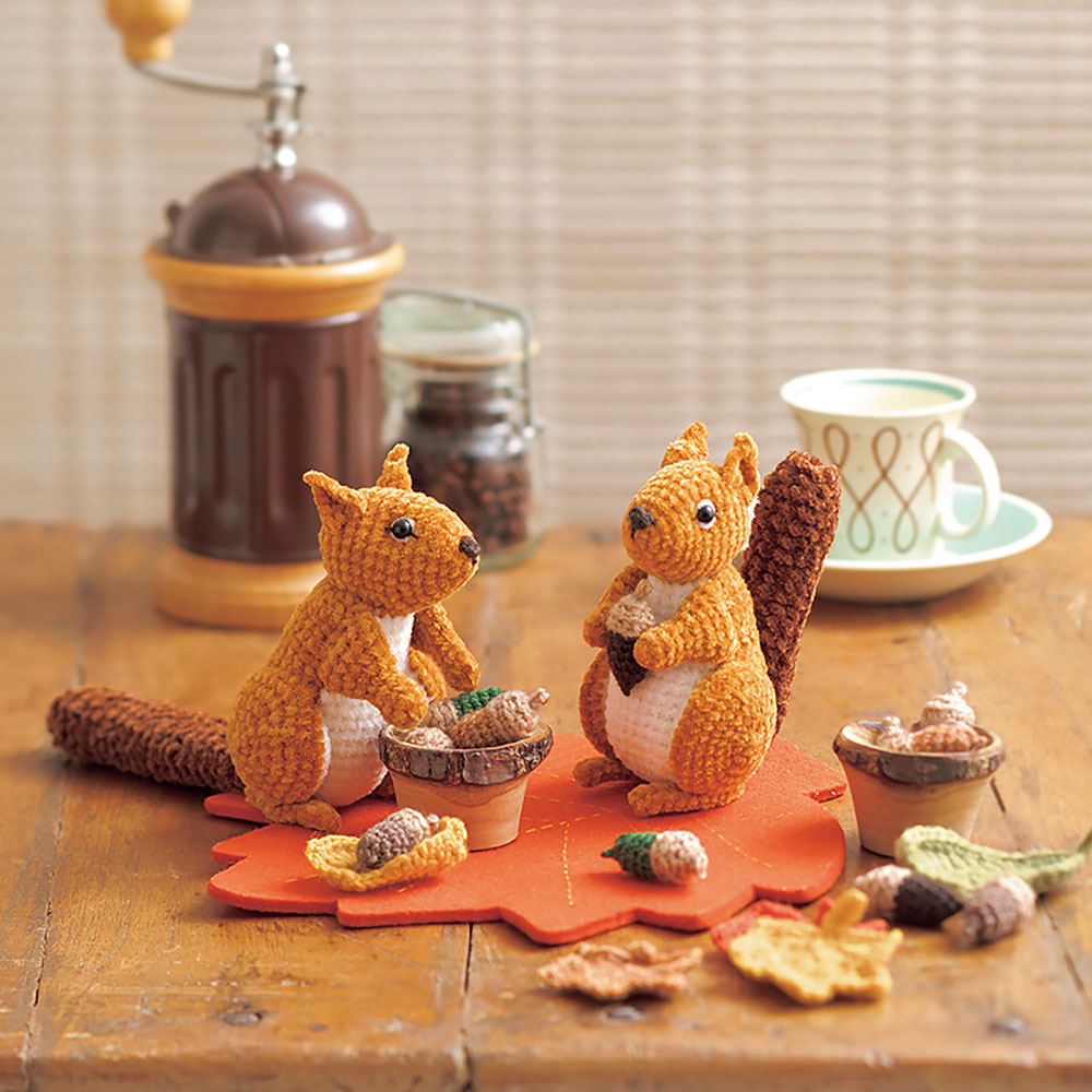 モールヤーンで編むリスは、フカフカな仕上がりです。切れ長のキリリとした眼差しに、車輪みたいな筋肉質な後ろ足が頼もしい。しっぽや耳のつけ方、目鼻の位置など、ちょっとした手加減で表情が変わります。どんぐりの実の部分は、若いものから熟成タイプ?!までいろいろと取り揃えて。飾り用の落ち葉は、形や糸を少しずつ違 えてカラフルに。小さな世界を彩る粋な小道具です。
