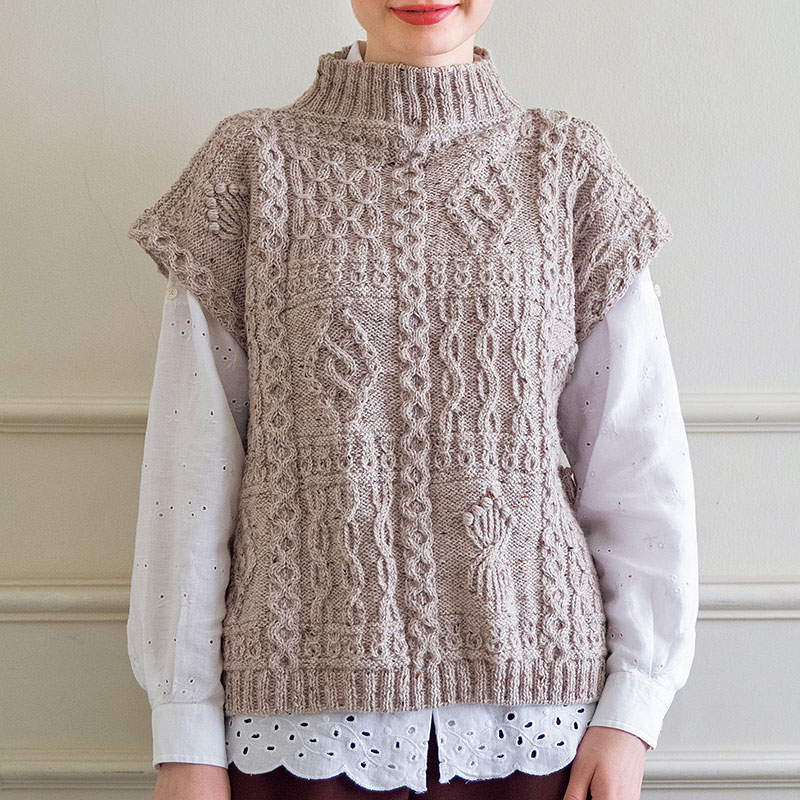 4種類のパターンを規則的にくり返して編む直線ベスト。ゆったりリラックス意識して、糸は自然な感じのツイードヤーン。前後の長さを変えていますが、長くしたい方は後ろと同じ長さを2枚編み、短く仕上げたい方は前を2枚と、自由にアレンジなさってください。身幅はフリーサイズでゆったりしています。4種類のパーツの一部を変えて、自分らしさを加えてみるのも楽しいアレンジレッスンです。