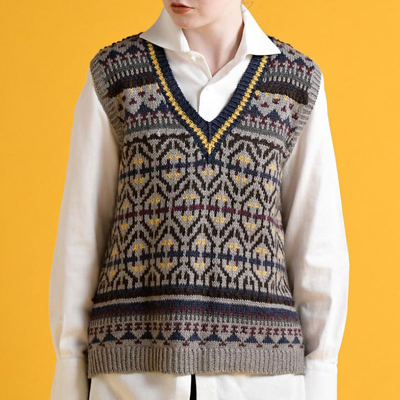材料:K’sK スタイプ グレー(16)185g/5 玉、えんじ(54)35g/1玉、こげ茶(44)30g/1玉、紺(43)25g/1玉、黄(94)10g/1玉、チャコールグレー(28)5g/1玉。