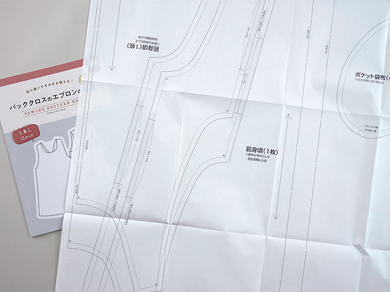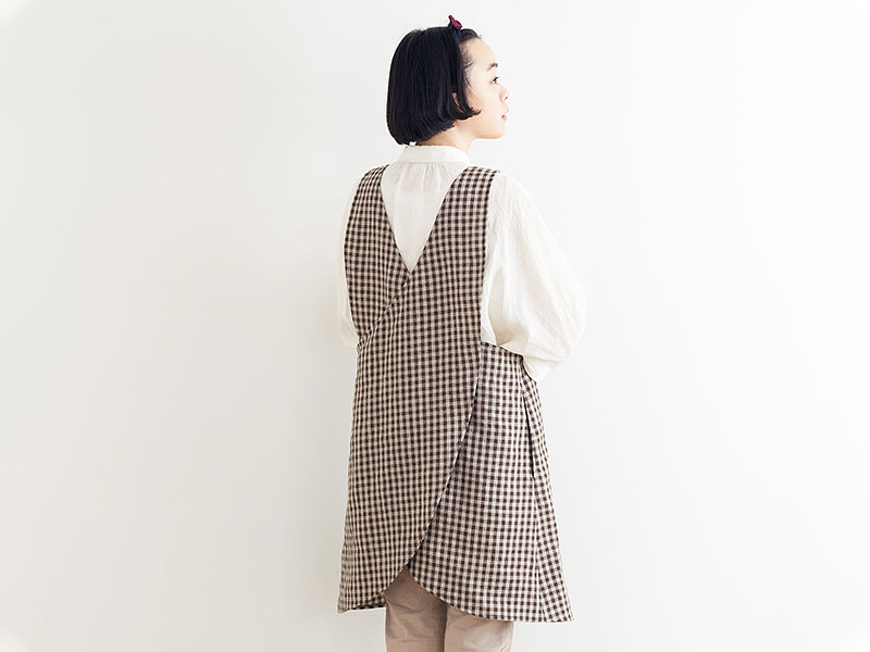 腰ひもや首ひも、ボタンがなく、すっぽりかぶりで着られるエプロンです。前身頃と後ろ身頃を肩と脇で縫い合わせ、バイアス布でぐるりと始末をします。