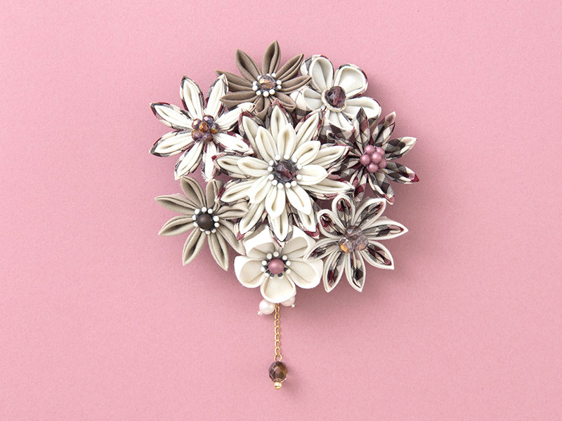 【キット作り方つき】 つまみ細工作家・つゆつきさんデザインのつまみ細工のコサージュ。一番人気のデザインを、先染め布も使い、ちょっとカジュアルな雰囲気に仕上げました。8輪からなる豪華な作品は、晴れの日に、普段使いにと様々に活躍します。カット済みの布が入っているので、すぐに作り始められます。