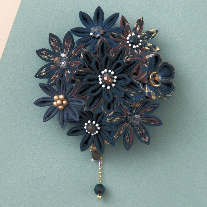 【キット作り方つき】 つまみ細工作家・つゆつきさんデザインのつまみ細工のコサージュ。一番人気のデザインを、先染め布も使い、ちょっとカジュアルな雰囲気に仕上げました。8輪からなる豪華な作品は、晴れの日に、普段使いにと様々に活躍します。カット済みの布が入っているので、すぐに作り始められます。