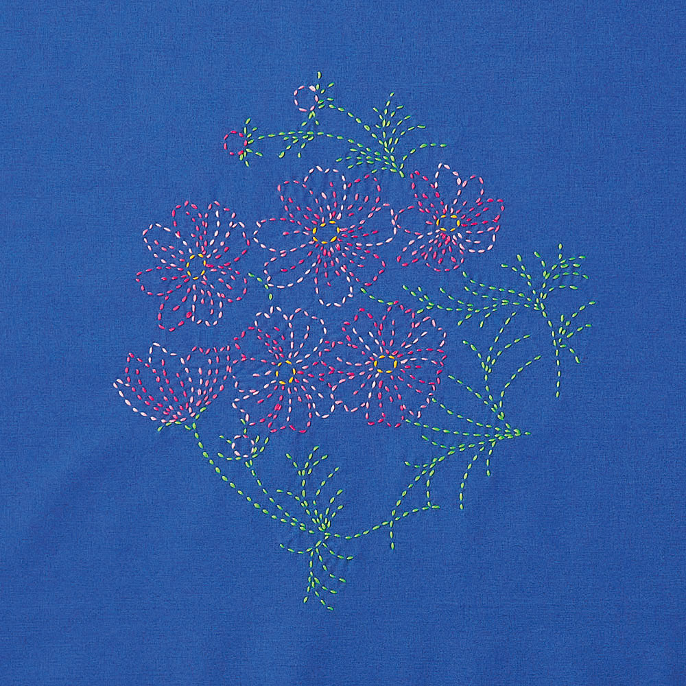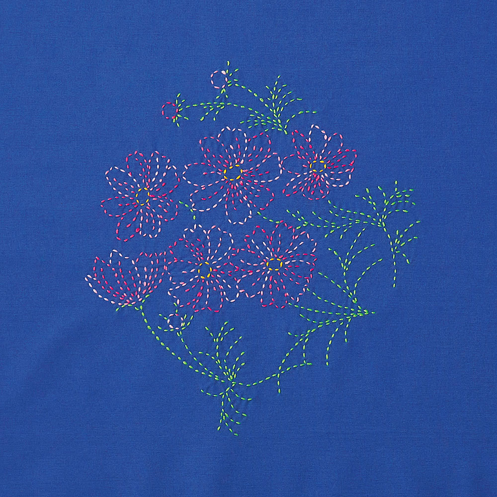 季節の花や果実をモチーフにした図案が印刷済みの風呂敷に、ちくちく刺し子を施して仕上げるキットです。縫製済みなので、刺しゅうを楽しむだけで完成します。