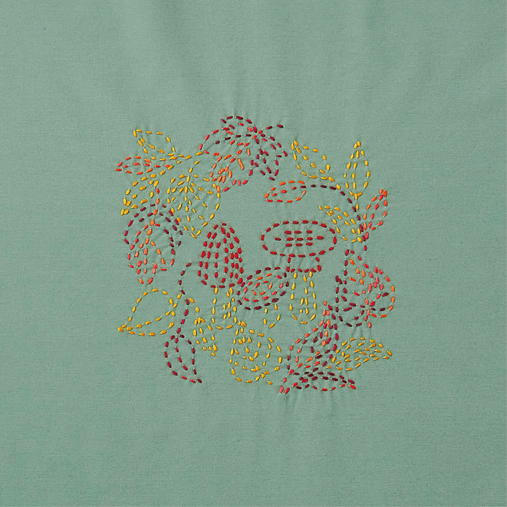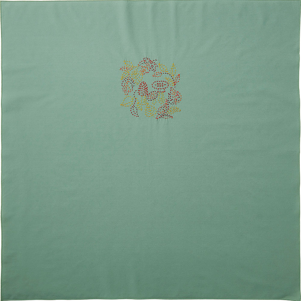 季節の花や果実をモチーフにした図案が印刷済みの風呂敷に、ちくちく刺し子を施して仕上げるキットです。縫製済みなので、刺しゅうを楽しむだけで完成します。