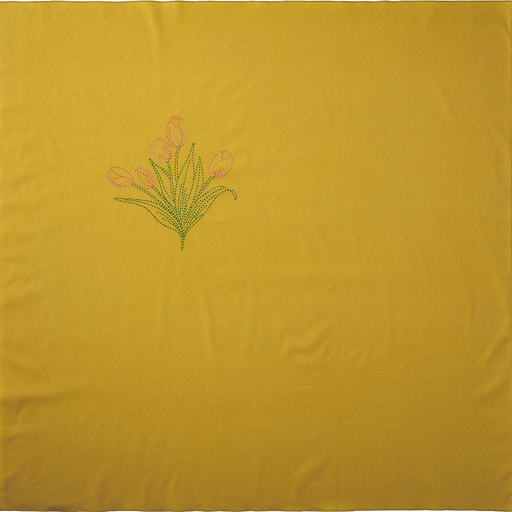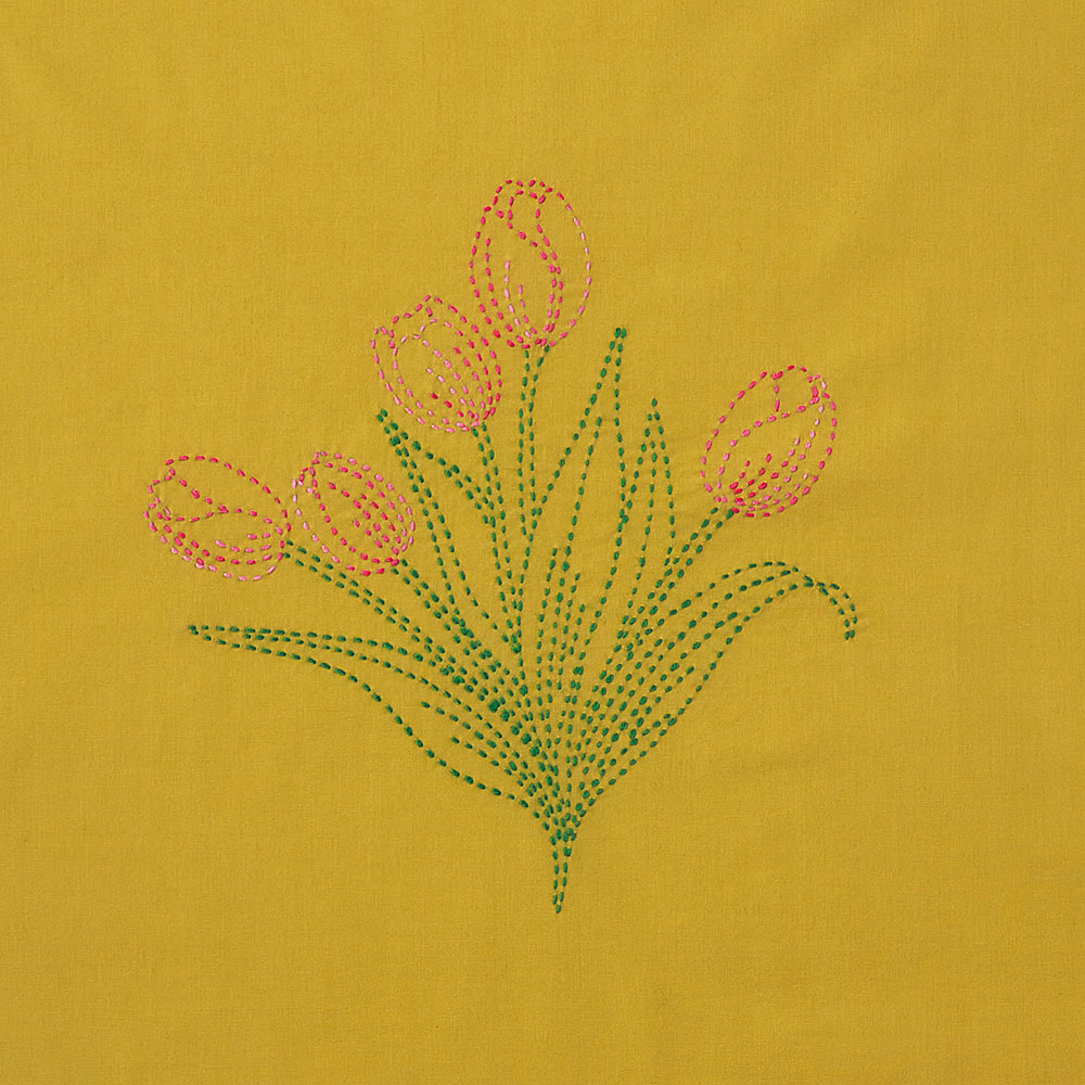 季節の花や果実をモチーフにした図案が印刷済みの風呂敷に、ちくちく刺し子を施して仕上げるキットです。縫製済みなので、刺しゅうを楽しむだけで完成します。