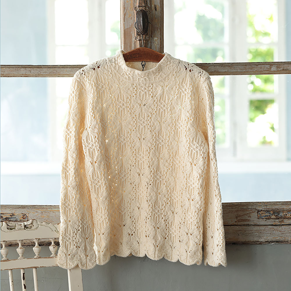 このプルオーバーの模様は私の模様作りの中で、忘れられないものです。毎段模様のアレンジで蝶のようなレース模様が生まれ、糸を巻く位置と回数を工夫して花の形になったスモック模様と出合いました。 花の左右にジグザグレースを加え、オリジナルな華のある模様になりました。 ※MサイズとLサイズを併記しています。各ページの印に従って貼り合わせると、大きな全図解の編み図としてご使用いただけます。