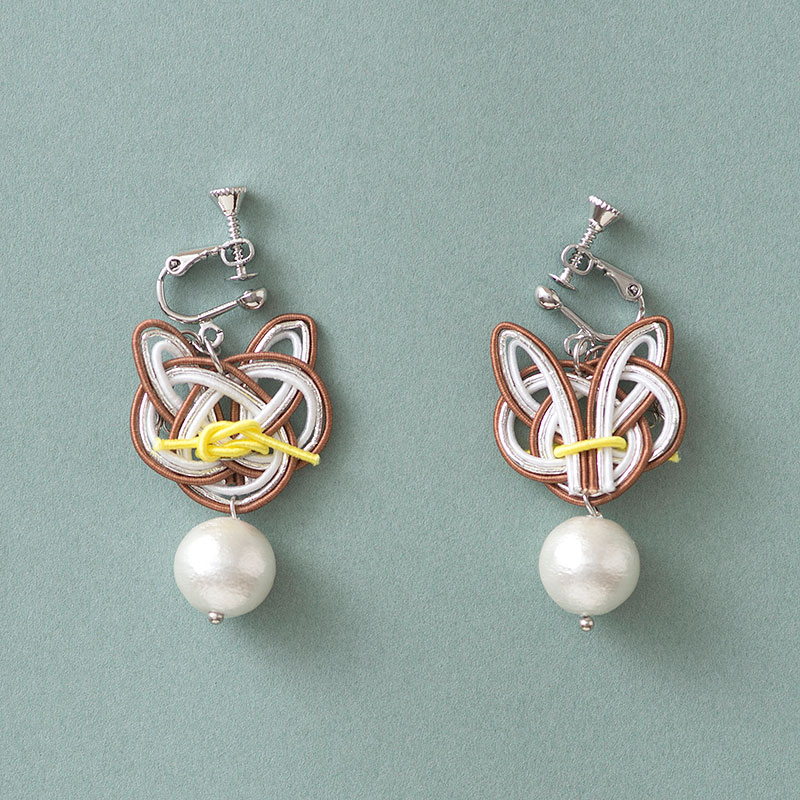 水引作家、mizuhikigirlさんデザインの、キュートな猫結びのピアス。イヤリングパーツもついているので、お好みのパーツで仕上げることができます。人気のコットンパールも使ったおしゃれなアクセサリーです。