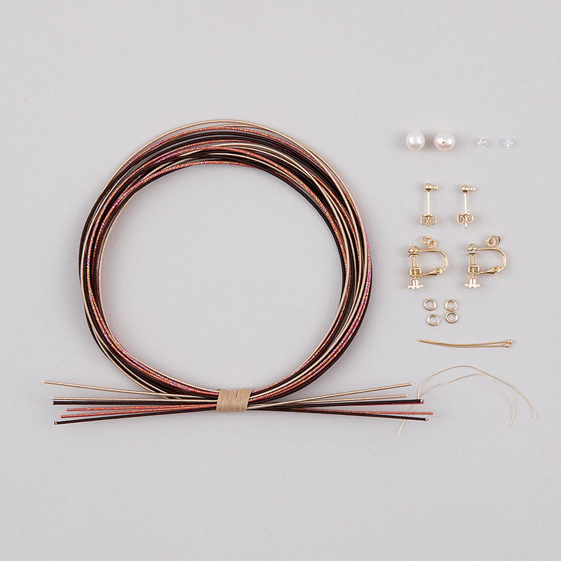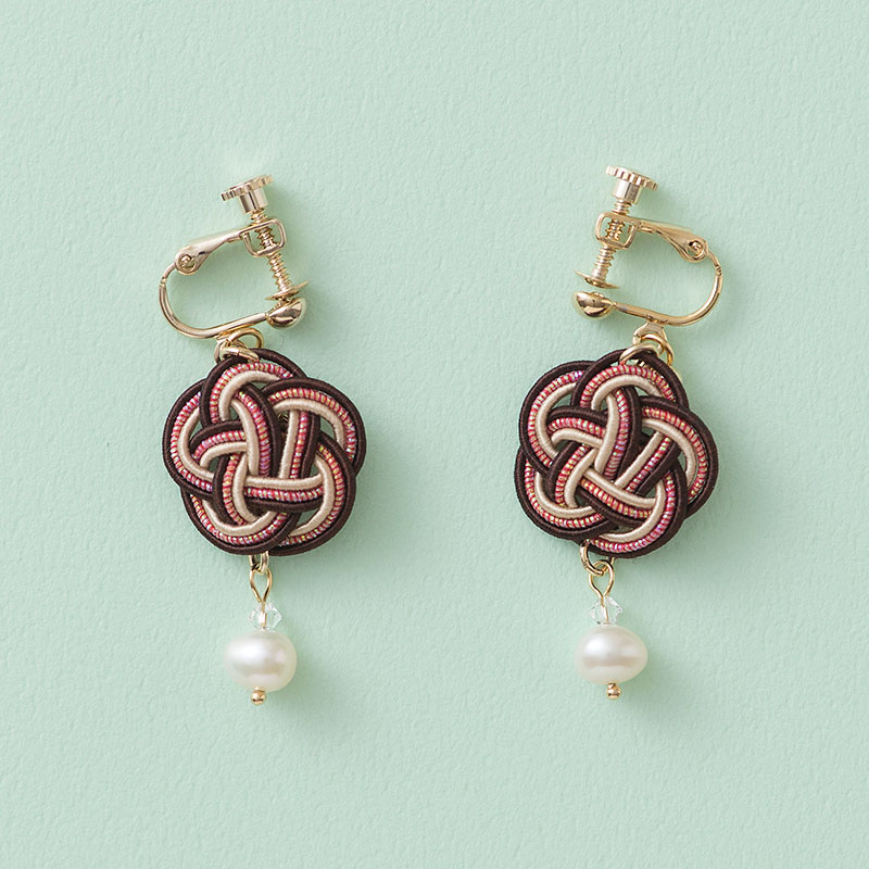 ビーズアクセサリー作家、Kellyさんデザインの水引アクセサリー。シックなカラーの水引を使った梅結びに、上品な淡水パールとスワロフスキーを合わせた洗練されたデザインのピアス。イヤリング金具もついているので、お好みの金具で仕上げてください。和の伝統工芸の技法を使いながらも洋風の雰囲気をあわせ持つアクセサリーは普段使いにもぴったりです。