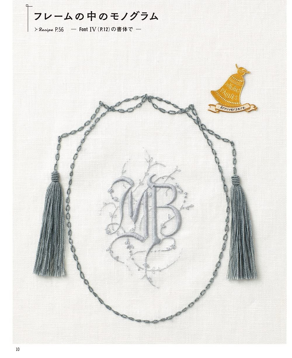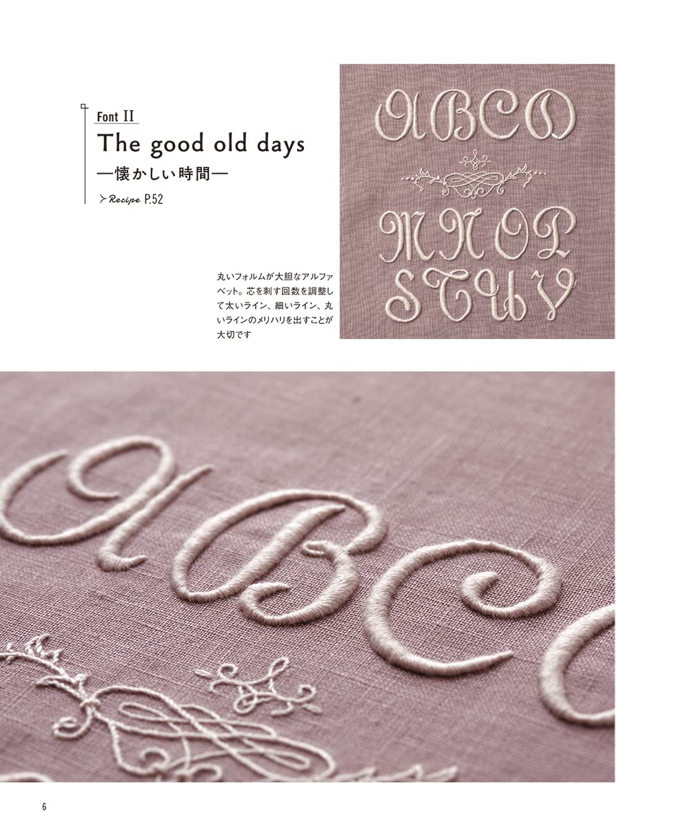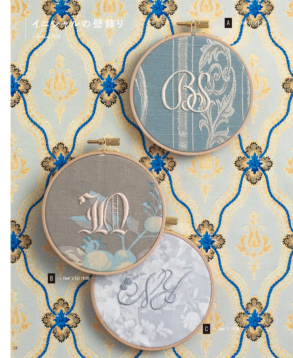 クラシックな書体から、装飾アルファベットまで9つの書体と、暮らしの中で使いたい小物をご紹介しています。芯入りサテンステッチで刺すアルファベットは、ヨーロッパのアンティーク刺繍のような雰囲気に仕上がるのが特徴。アルファベットと一緒に刺繍したい、王冠やフレームの図案も充実しています。