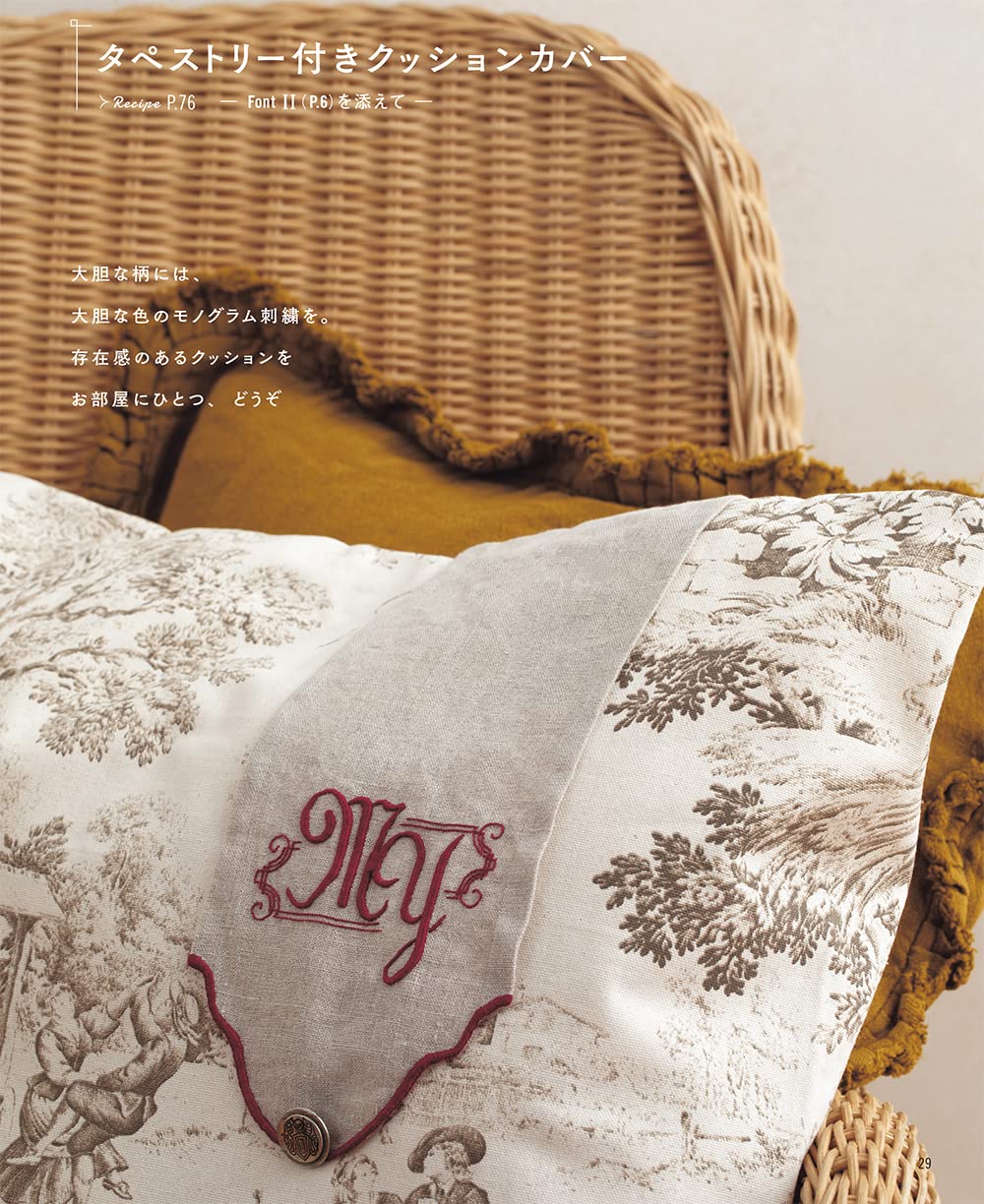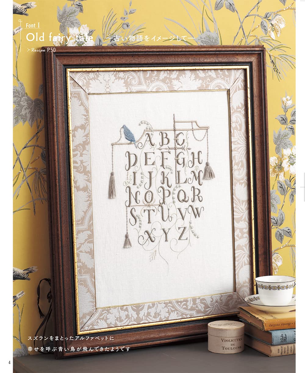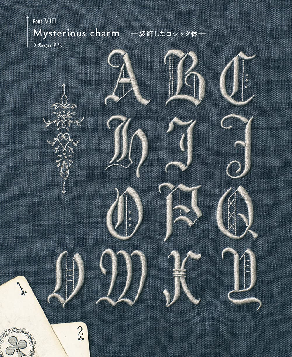 クラシックな書体から、装飾アルファベットまで9つの書体と、暮らしの中で使いたい小物をご紹介しています。芯入りサテンステッチで刺すアルファベットは、ヨーロッパのアンティーク刺繍のような雰囲気に仕上がるのが特徴。アルファベットと一緒に刺繍したい、王冠やフレームの図案も充実しています。