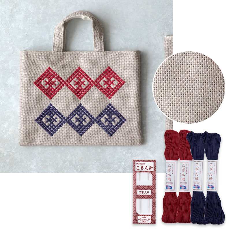 「ステッチイデー」vol.35 28ページ掲載の作品に使用しています。 初心者にもおすすめの、刺しやすいこぎん刺し用の布とこぎん糸、こぎん針のセットです。模様は正方形に仕上がります。
